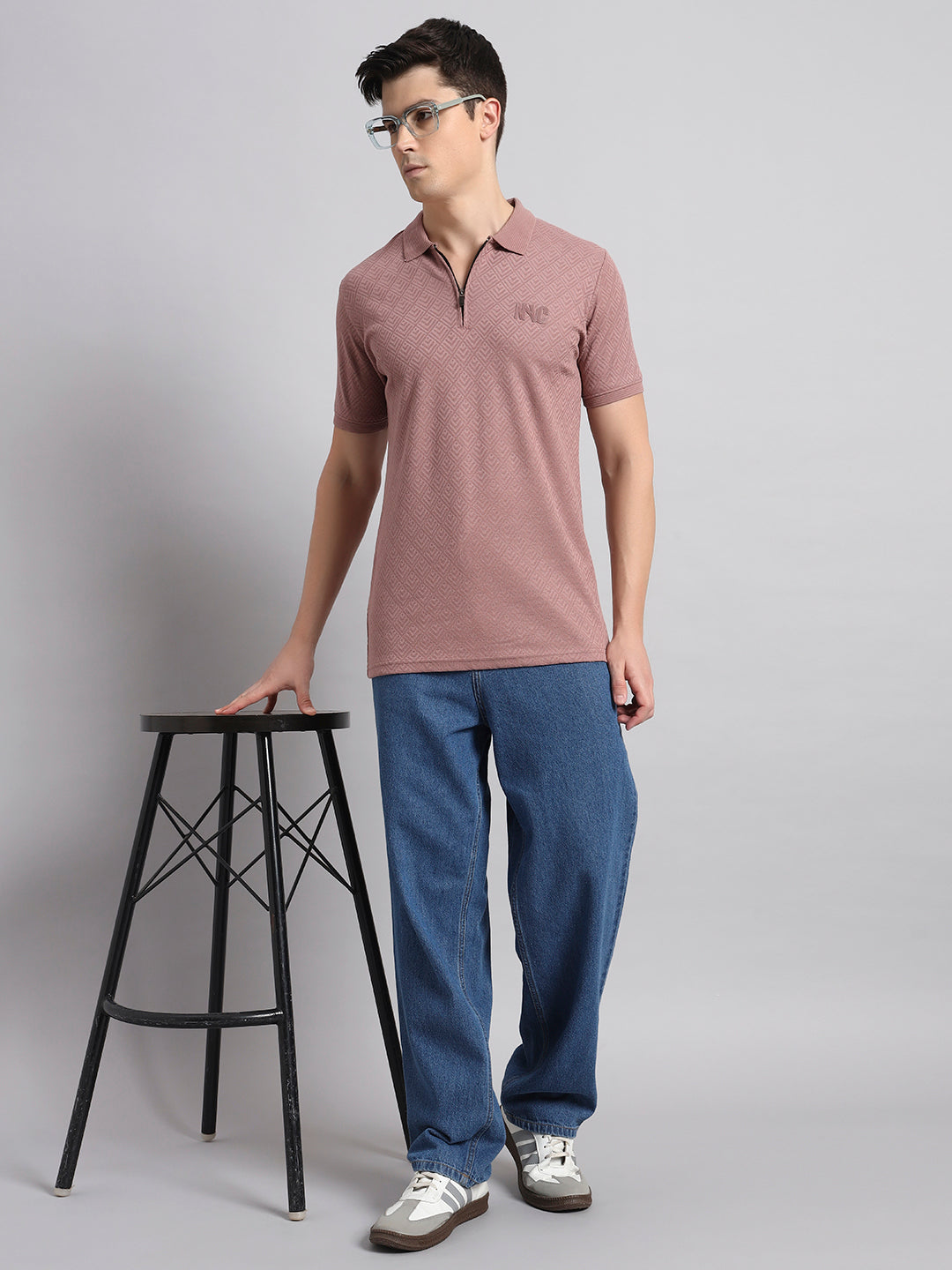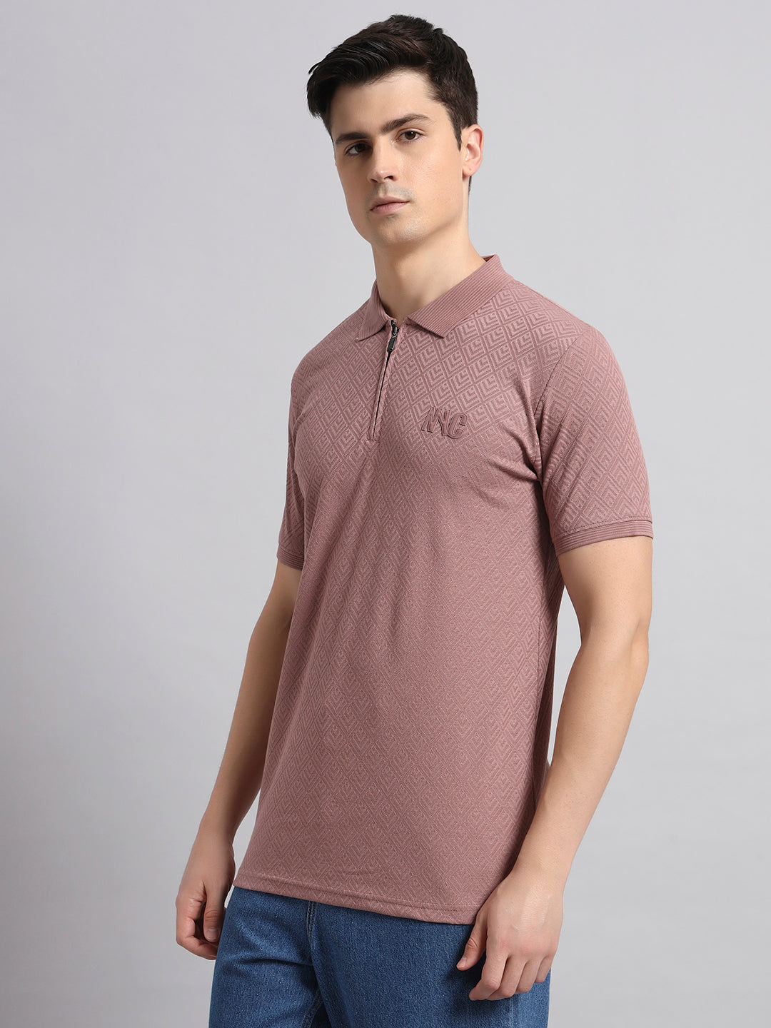 Men’s Mauve Textured Polo T-Shirt with Zip Collar
